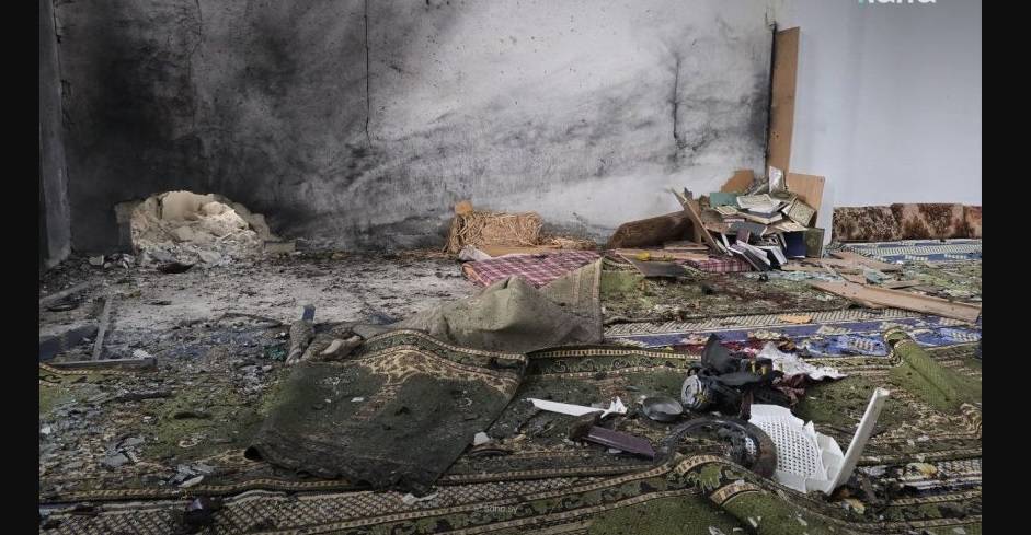 وأظهرت اللقطات من المكان فجوة في الجزء السفلي من جدار في زاوية المسجد. وقد كسا الدخان الأسود جزءاً من الجدار، وتبعثرت قطع من السجاد وكتب قربه، بينما تحطم زجاج النوافذ.